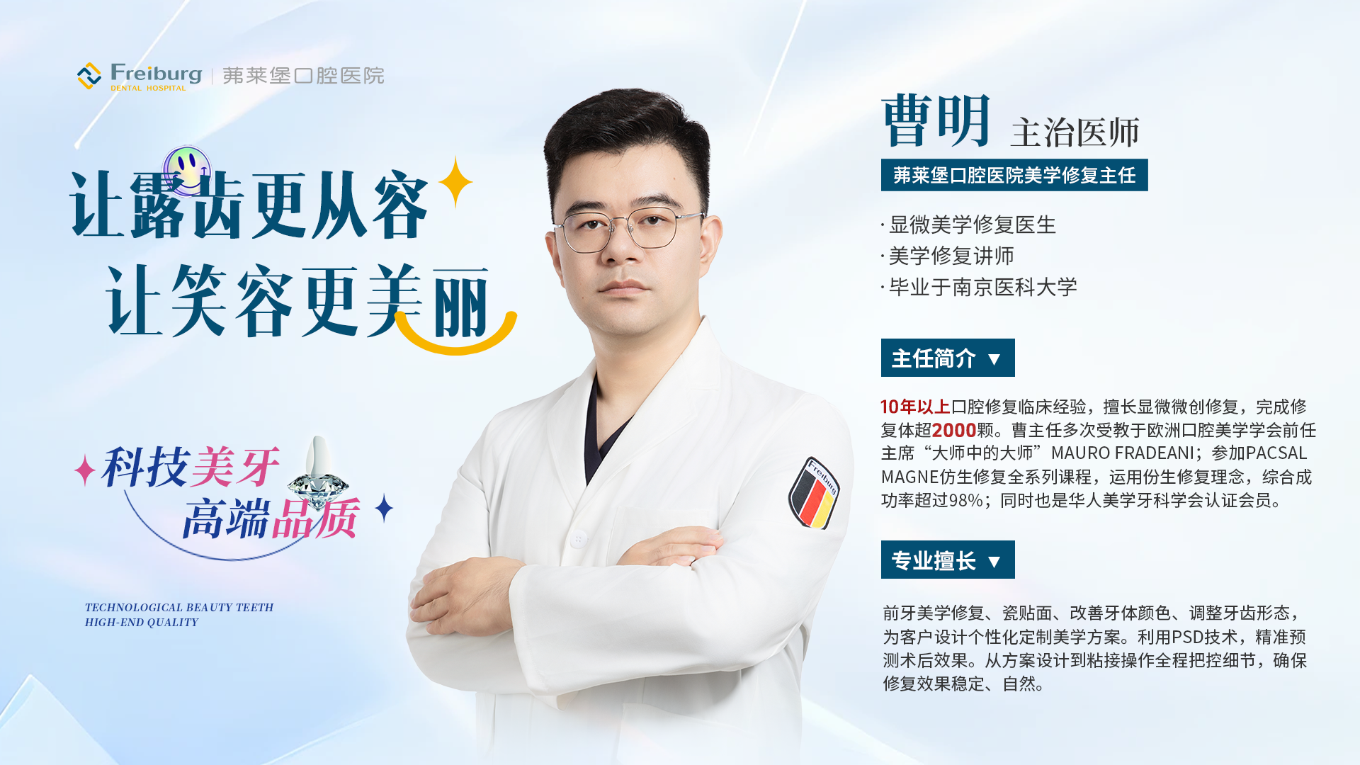 曹明: 我们把“可预见与可控”做成标准流程。茀莱堡具备六重精研的质量体系:严选材料、CAD/CAM 精密切削、显微粘接、数字化设计、院内一体化义齿加工中心与程控消毒供应中心;团队由国内外培训背景的专家组成,我本人也有多年显微微创与美学修复经验,修复体超 2000 颗。我们强调先试戴、再决定、最后维养——把每一步都做到你能看见、能体验、能信赖。茀莱堡口腔医院是一家全国连锁口腔医院,目前在江苏、安徽均有分院;健康咨询:4 0 0 -1 0 9 9 -0 2 5 或点击顶部图片直接咨询在线医生免费为您解答。